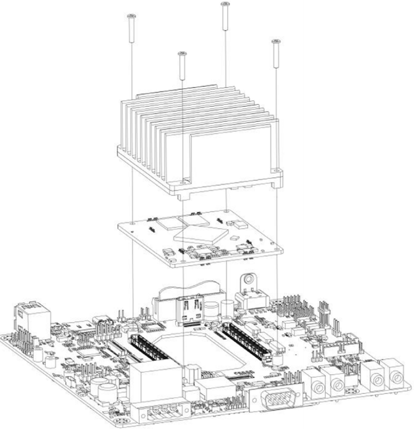 These figures demonstrate the order of assembly needed when attaching the thermal module and COM module to the carrier board.