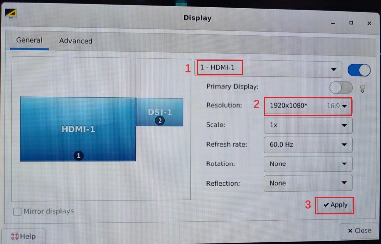- Click “Applications” -> “Settings”->“Display”. 2. Choose “HDMI-1”or “DP-1”, then choose “Resolution”. 3. Click “Apply”.